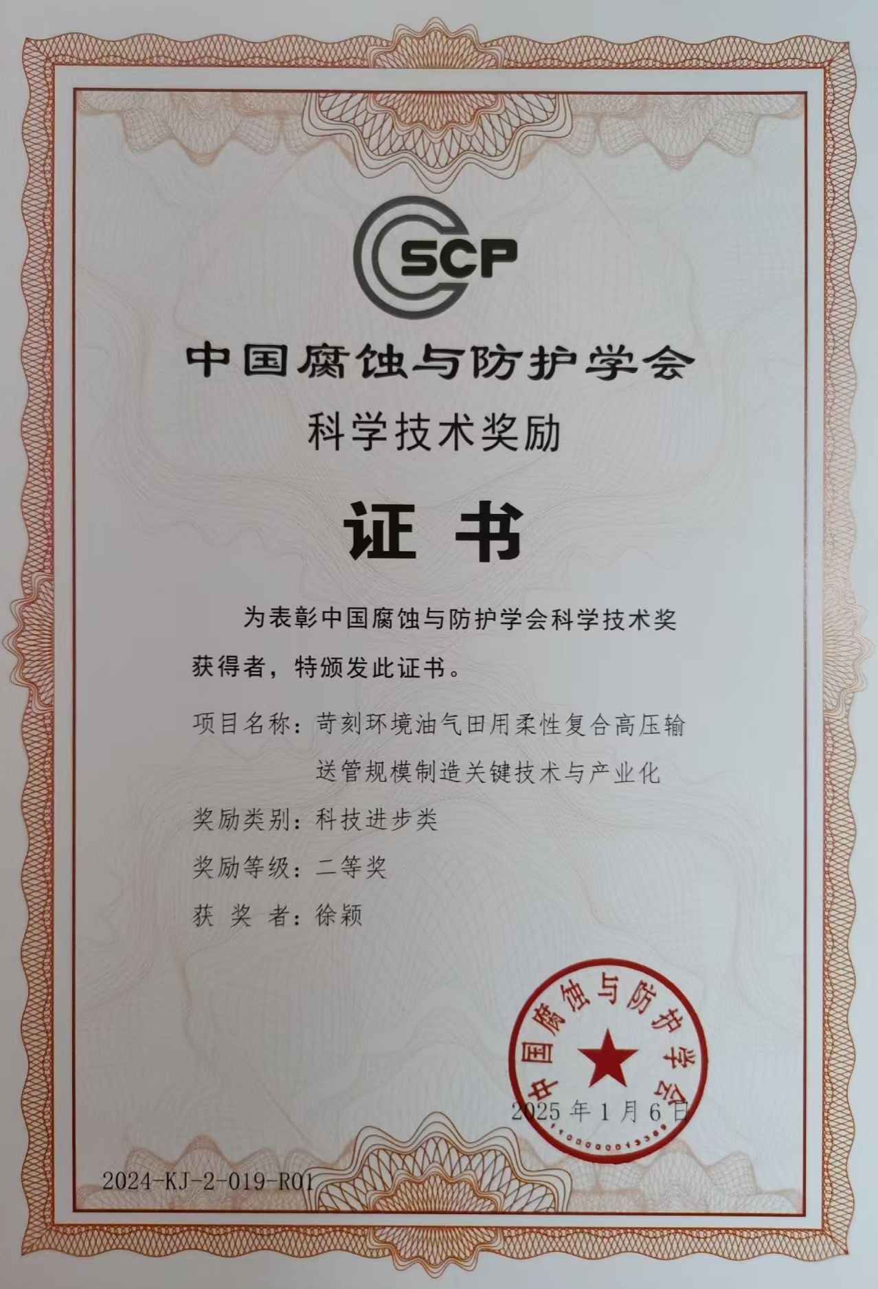 日前,由公司徐颖教授团队牵头,联合上海工程技术大学、中石化西北油田分公司、中石化江汉石油工程设计有限公司、江苏正道海洋科技股份有限公司等多家单位共同完成的《苛刻环境油气田用柔性复合高压输送管规模制造关键技术与产业化》项目,荣获2024年度中国腐蚀与防护学会科技进步二等奖。