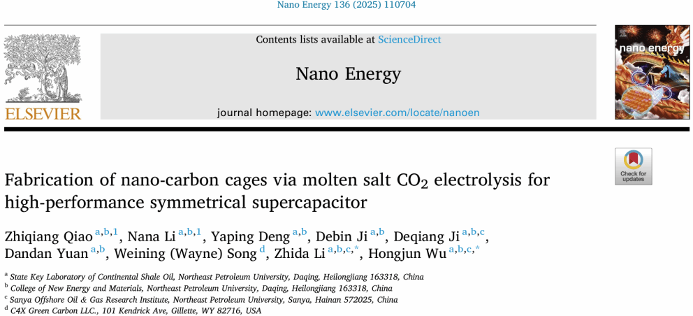 近日,best365中国官方网站吴红军教授团队成员乔志强博士在材料科学顶级期刊《Nano Energy》(IF=16.8)发表题为《Fabrication of Nano-Carbon Cages via Molten Salt CO2 Electrolysis for High-Performance Symmetrical Supercapacitor》的最新研究成果,在CO2高附加值转化利用方面取得重要进展。该成果在研究工作中得到中央支持地方高校改革发展资金、黑龙江省自然科学基金和黑龙江省头雁团队项目支持。